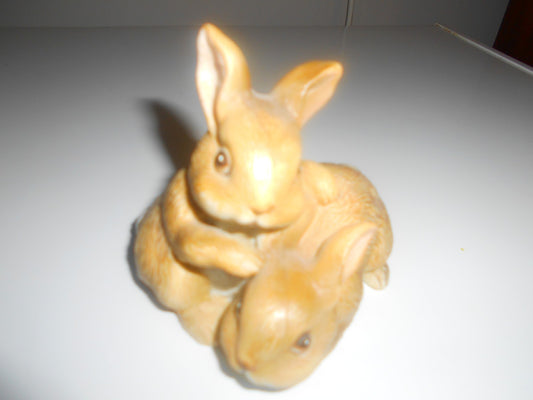 Vintage Homco #1455 Ceramic Rabbit, Brown Baby Bunny, Rabbits Cuddling Figurine