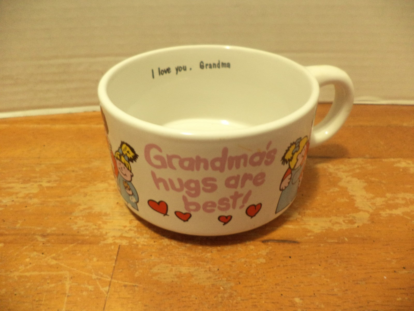 The product is a multicolor ceramic and porcelain soup mug featuring the phrase "Grandma's Hugs Are Best & I Love Grandma." This collectible item is perfect for showing love and appreciation for grandmothers while enjoying a warm meal. The unique design and material make it a special and meaningful addition to any kitchen or dining set.